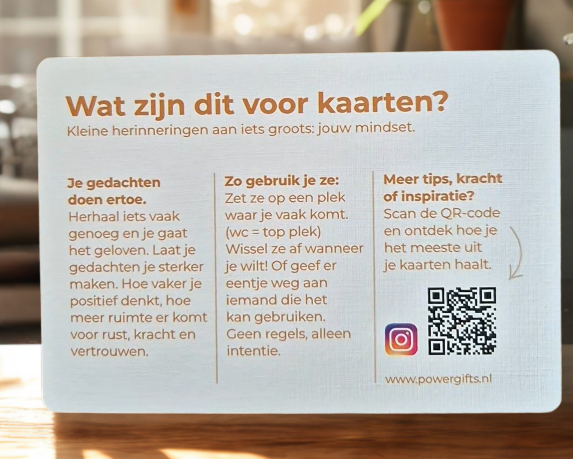 Plaats de mindsetkaarten op een plek waar je vaak langsloopt. De wc is bijvoorbeeld een top plek! Daar heb ik altijd een kaartje staan. De kracht van herhaling helpt je om een positieve mindset te behouden!